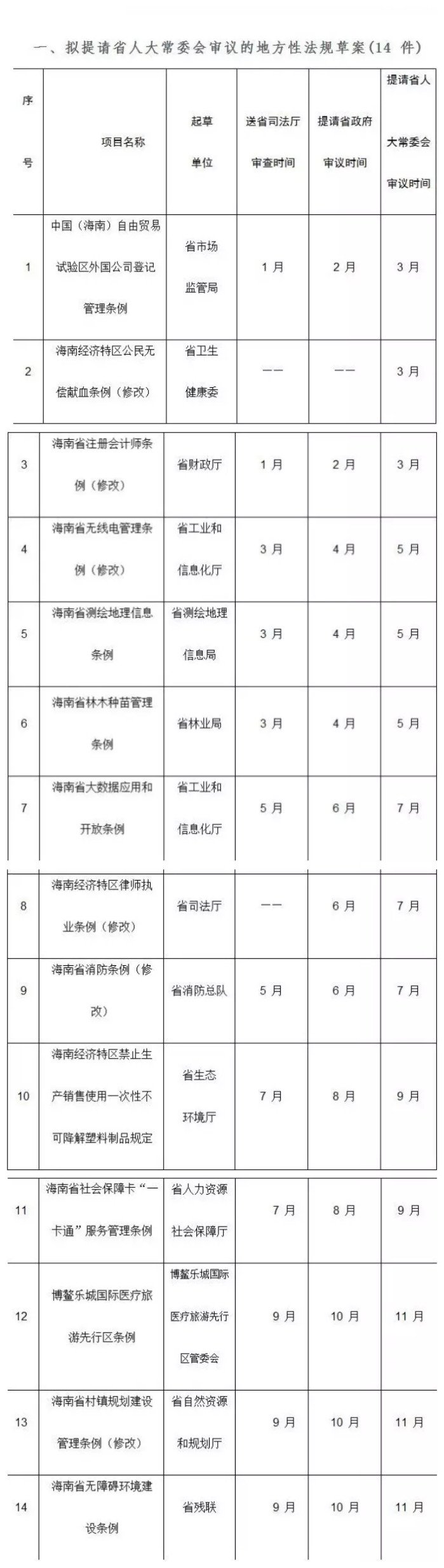 《计划》中明确了2019年海南立法工作共有58个项目,其中包括14件拟提请省人大常委会审议的地方性法规草案,7件拟制定、修改的省政府规章和37件研究起草、条件成熟时适时提请审议的地方性法规、省政府规章项目。