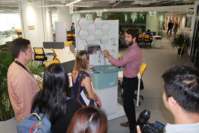 ↑海口复兴城国际离岸创新大厦的外国“创客”给外媒记者们展示智能绿墙产品。