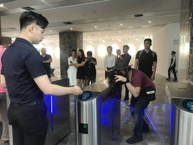 ↑闪易科技负责人介绍“一闪过门禁”的产品应用场景。