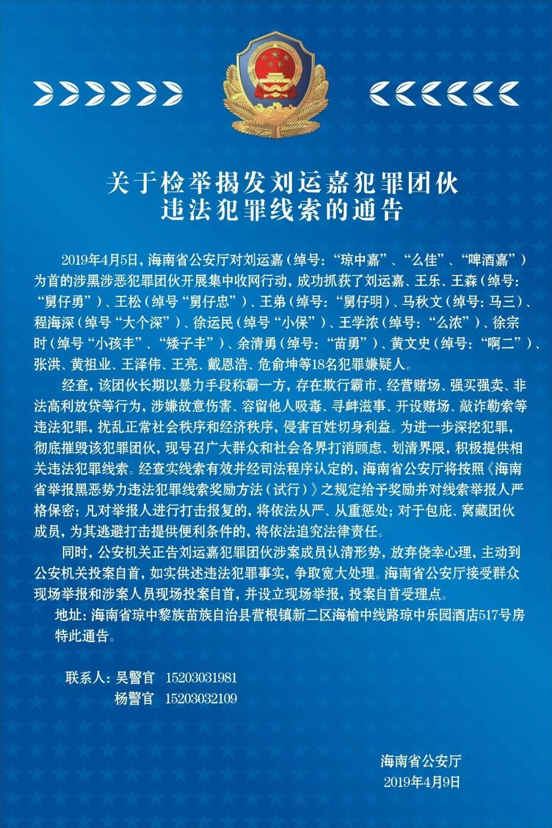 2019年4月3日至5日,海南省公安厅刑警总队联合万宁市公安局出动200名精干警力,对刘运嘉(绰号:“琼中嘉”、“么佳”、“啤酒嘉”)为首的涉黑涉恶犯罪团伙开展集中收网行动,成功抓获了刘运嘉、王乐、王森(绰号:“舅仔勇”)、王松(绰号“舅仔忠”)、王弟(绰号:“舅仔明)、马秋文(绰号:马三)、程海深(绰号“大个深”)、徐运民(绰号“小保”)、王学浓(绰号:“么浓”)、徐宗时(绰号“小孩丰”、“矮子丰”)、余清勇(绰号:“苗勇”)、黄文史(绰号:“啊二”)、张洪、黄祖业、王泽伟、王亮、戴恩浩、危俞坤等18名犯罪嫌疑人。扣押管制刀具、涉案财物一批、冻结涉案资金约900万元人民币。