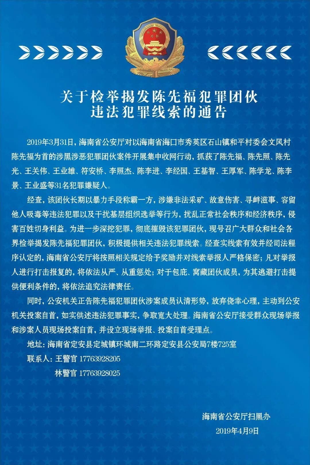 4月10日下午,海南省公安机关扫黑除恶专项斗争2019年第三场新闻发布会上,省公安厅通报了刚刚侦办的海口秀英区陈先福涉黑涉恶团伙、琼中县刘运嘉涉黑涉恶团伙案件情况。