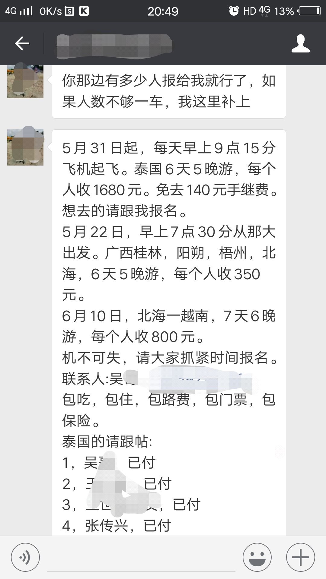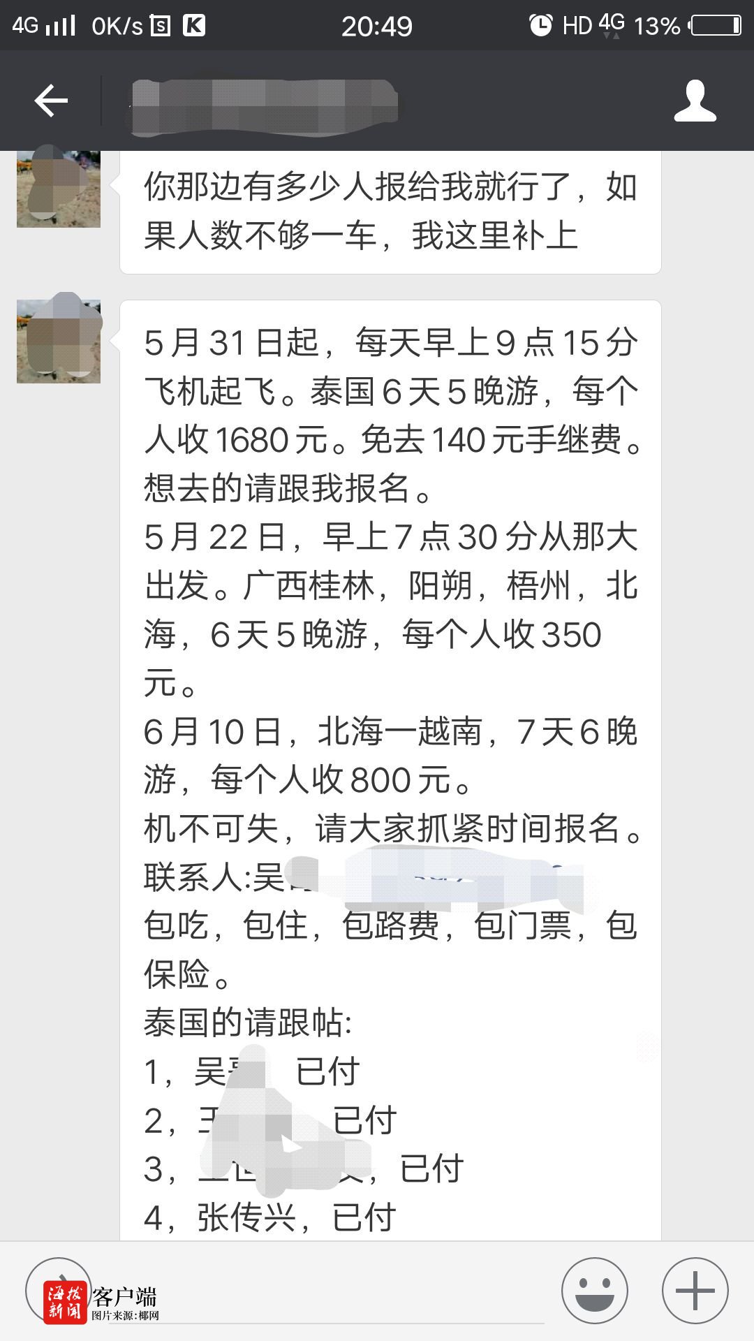 记者看到吴某发来近期旅游信息显示:“5月31日,泰国6天5晚,每人收费1680元。广西桂林、阳朔、梧州、北海6天5晚游,每个人收费350元。6月10日,北海到越南,7天6晚游,每人收800元”。同时注明以上费用包含食宿、路费、门票和保险。记者质疑收费低廉是否能抵过旅行社成本?吴某表示,他们组团出镜和出省旅游是受国家“扶贫”政策的补贴。