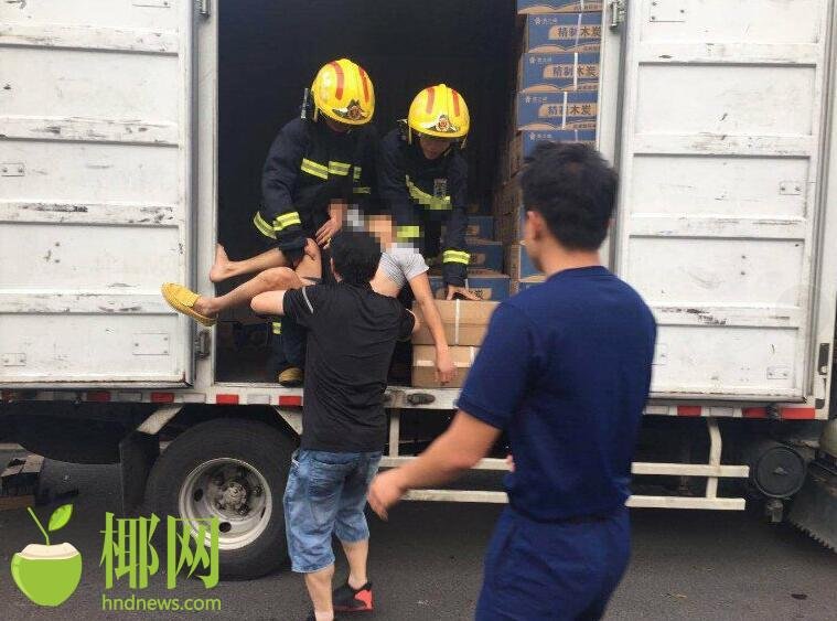 6月2日6时5分,海口市119指挥中心接到市民报警称,位于美兰区美苑路路边,有人被困在集装箱里,请求救助。指挥中心立即调派白龙中队1辆抢险救援消防车、1辆城市主战消防车,由指导员王业治带领9名消防员赶赴现场救援。
