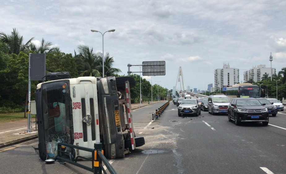 记者从李先生提供的视频和图片中看到,一辆水泥罐车侧翻在海口市甸昆路南往北向最右侧车道,巨大的冲击力,撞开了路边的几节护栏。水泥罐车前挡风玻璃破碎,现场散落着车辆的零碎件。在水泥罐车侧后方,则停着一辆被剐蹭的小轿车,海口交警接报后很快到达现场进行交通疏导和事故调查。