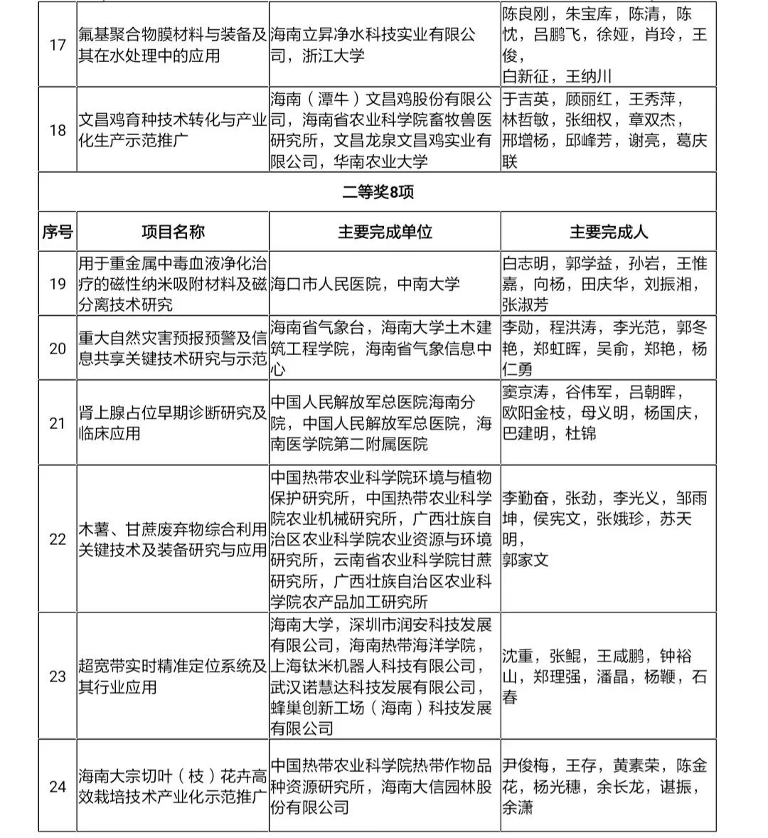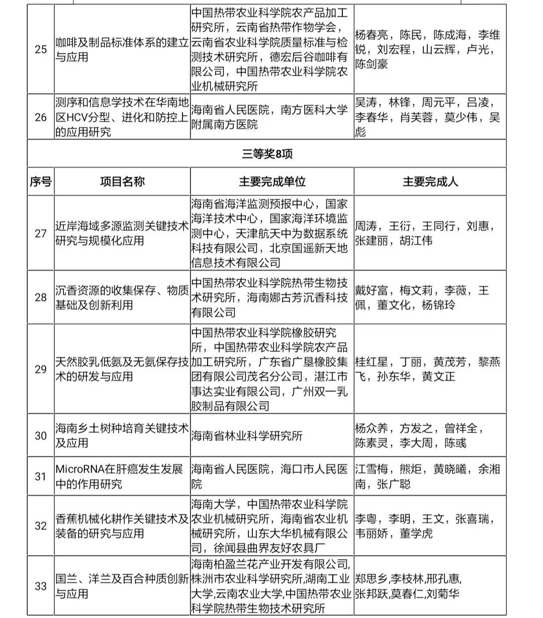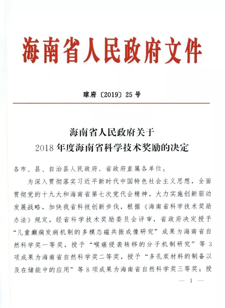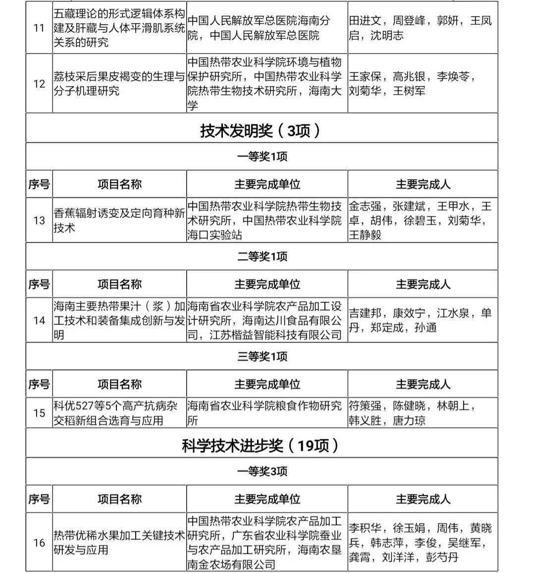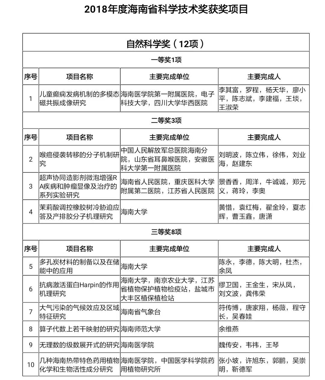 日前,海南省政府印发了《海南省人民政府关于2018年度海南省科学技术奖励的决定》,获奖项目35项,其中一等奖5项、二等奖12项、三等奖17项,国际科学技术合作奖1项。获奖项目主要分布在农林牧渔业、制造业、电子信息、科学研究和技术服务、卫生和社会等领域,紧密结合海南经济社会发展,多学科交叉整合、联合攻关,自主创新能力和总体水平呈上升趋势。