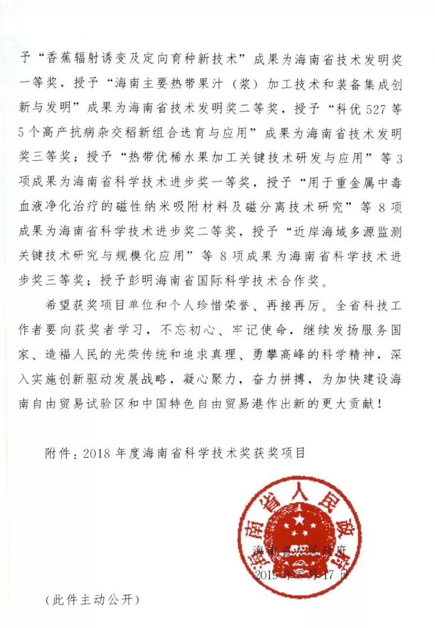 据了解,2018年度海南省科学技术奖采取自由申报方式申报。项目评审采取专业评审组评审和省奖励委员会评审方式。专业评审组聘请47名外省专家,对项目申报材料认真审阅,充分讨论酝酿,按比例无记名投票,推荐获奖项目;省奖励委员会采取项目汇报、答辩、委员会成员记名投票方式,按得票顺序确定等级。评审结果经过公示、省科技厅复核、报省人民政府批准等环节,每个环节都设定具体条件和明确要求,环环相扣,评审奖励科学规范,公正透明,体现海南省科技创新发展战略和奖励政策导向。
