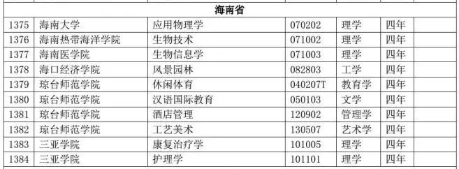 《通知》显示,海南大学将新增应用物理学专业,海南热带海洋学院将新增生物技术专业,海南医学院新增生物信息学专业,三亚学院将新增康复治疗学、护理学共两个专业,以上专业学位授予门类均是理学。此外,海口经济学院将新增风景园林专业,学位授予门类是工学。琼台师范学院将新增休闲体育、汉语国际教育、酒店管理、工艺美术四个本科专业,学位授予门类分别是教育学、管理学、文学和艺术学,至此,作为海南本土以培养培训小学教育和学前教育教师为主要任务的省属师范类高校的琼台师范学院本科招生专业达到24个。