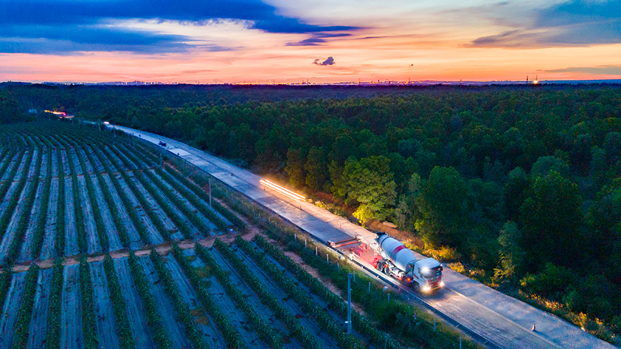 2020年9月16日傍晚,在海南省儋州市农村公路交通扶贫“六大工程”东王线东成至新州段,工作人员在加班铺设路面,工程进度加快推进。目前,儋州市正进一步加快农村公路“六大工程”的建设,进一步加快打造“40分钟生活圈,1小时交通圈”的进程。(海南日报记者陈元才摄)