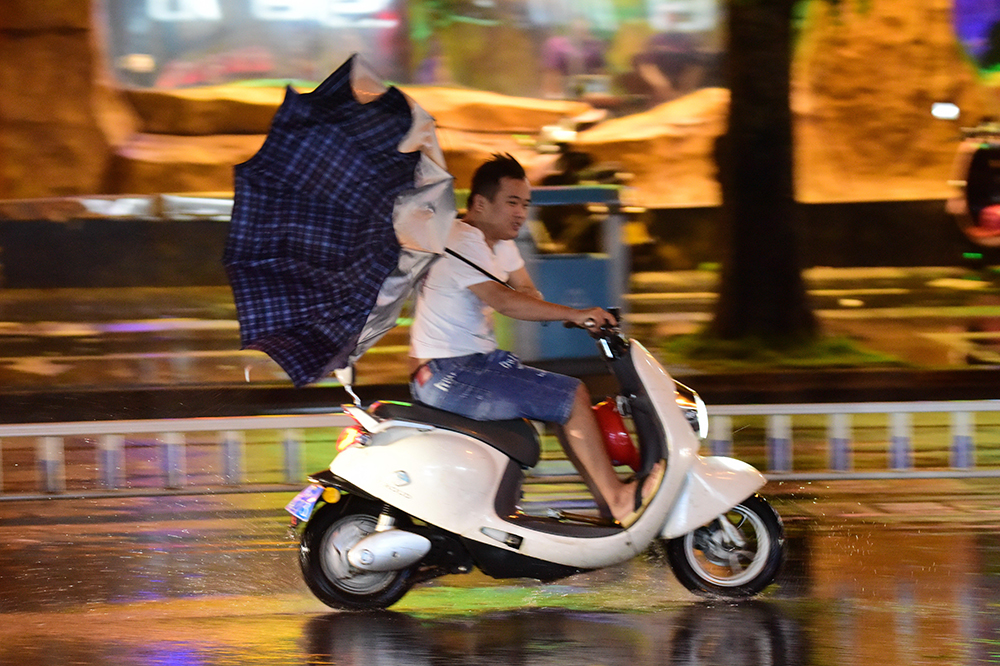 10月13日晚,琼海市民在风雨中出行。今年第16号台风“浪卡”当天傍晚7时20分前后在琼海市沿海登陆,中心附近最大风力10级,成为今年登陆海南的首个台风。(海南日报客户端特约记者蒙钟德摄)