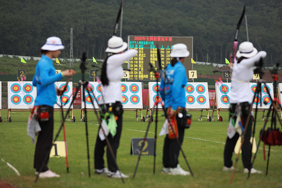 11月5日,2020年全国射箭冠军赛在海南白沙文体中心进行到第二天。该赛事吸引北京、上海、广西等国内29支队伍近300名射箭运动员参加,其中包括国家射箭队运动员。在本次比赛中表现优秀的冠军箭手,将入选国家射箭集训队。此外,备战东京奥运会的射箭运动员也角逐本次比赛,为奥运会模拟训练。图为:11月5日,在白沙黎族自治县文体中心田径场,选手参加反曲弓女子个人30米比赛。(海南日报记者王黎刚李天平文/图)