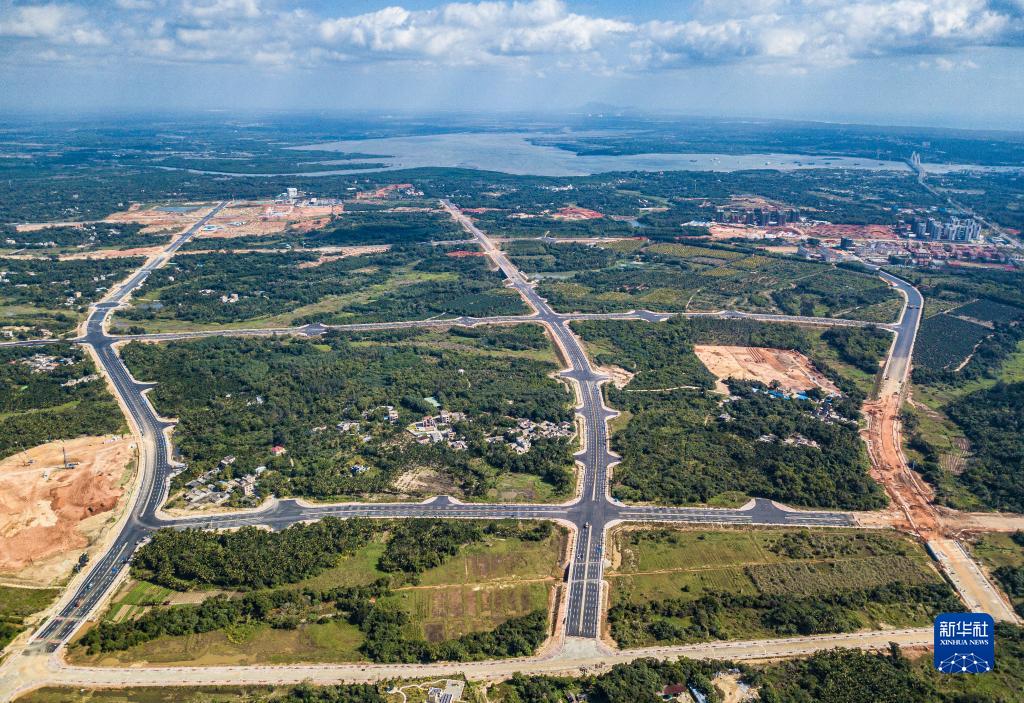 12月26日拍摄的建设中的文昌国际航天城起步区“三横五纵”路网工程项目(无人机照片)。近日,在海南自贸港重点园区——文昌国际航天城内,新建的紫贝大道、八门湾大道、云华路和云汉路实现功能性通车。这些道路属于文昌国际航天城起步区“三横五纵”路网工程项目。该项目将新建7条主干道,完善沿线道路交通系统和市政基础设施,推进文昌国际航天城建设。(新华社记者蒲晓旭摄)